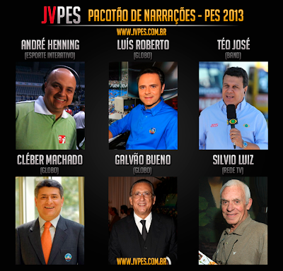 Descrição: Pacotão de narração para o PES 2013. Com 6 narradores são eles André Henning(Esporte Interativo), Luís Roberto (Globo), Téo José (Band), Cléber Machado (Globo), Galvão Bueno (Globo), Silvio Luiz (RedeTV) e Jhony Borda.